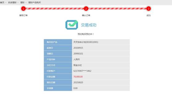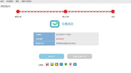 8. 点击“确认”,显示交易结果,购买成功页面,如下图: