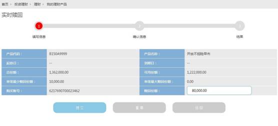 2、点击“实时赎回”按钮,进入实时赎回操作流程,显示产品基本信息、持有份额、购买账号(注:此账号为实时赎回成功后的资金返还账号)以及赎回份额输入框,如下图: