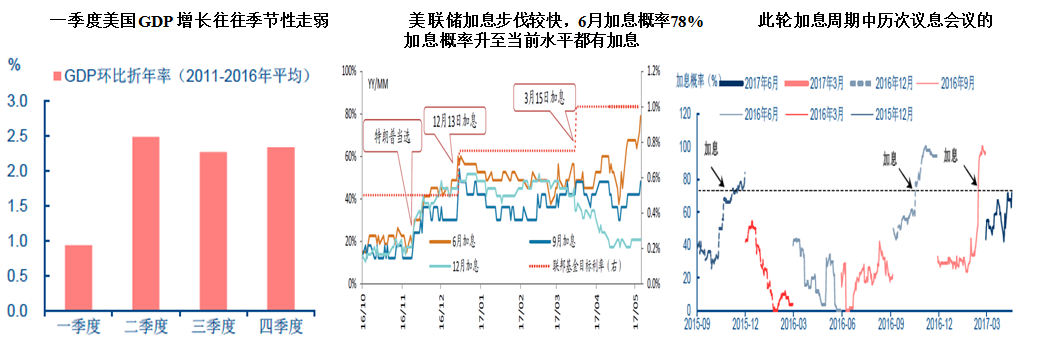 美国:美国经济仍处于复苏趋势中,非农就业数据表现较好,六月加息概率较高。