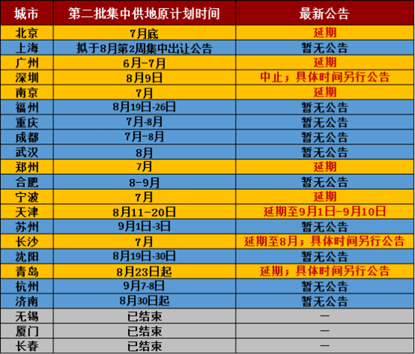 据城市官方公告,22个集中供地城市中,除了早在6月已经完成了第二批集中供地的无锡、厦门、长春,过半城市已经透露出了延期第二批集中供地计划的意思。